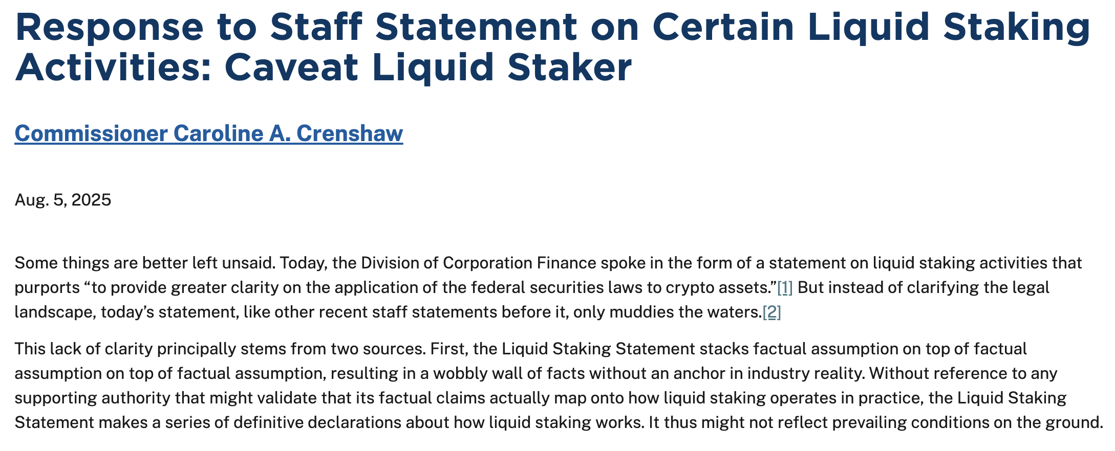 Комісар США SEC Каролайн Креншо різко розкритикувала заяву про персонал, опублікований у вівторок відділом фінансування корпорацій регулятора, який похвалив позицію SEC щодо ліквідної ставки, заявивши, що вона створила більше плутанини, ніж ясності.