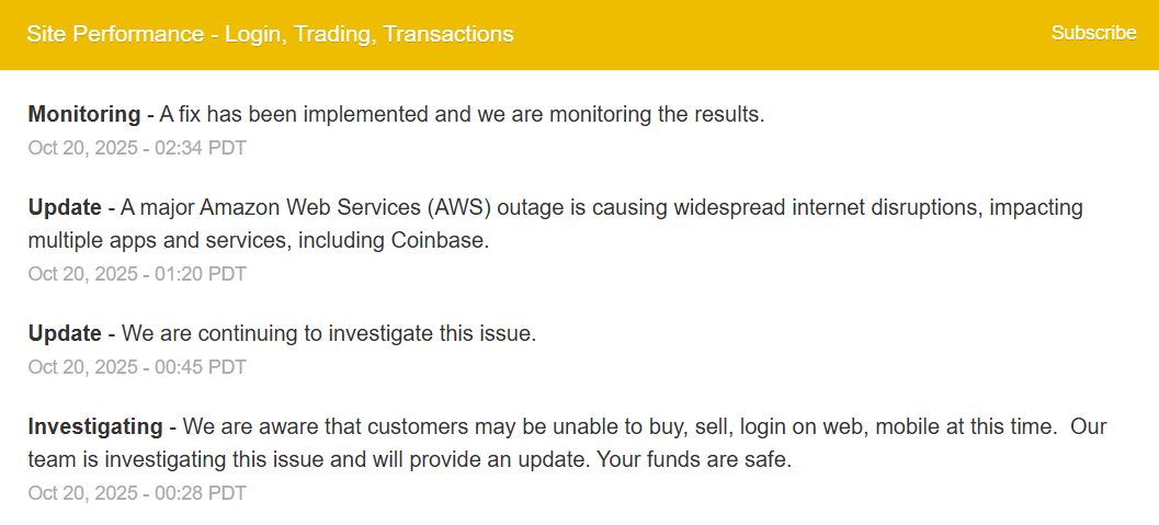 Coinbase і Robinhood були серед кількох основних платформ, які постраждали від збою в центрі обробки даних Amazon Web Services (AWS) у понеділок, що підкреслює ризики покладатися на централізованих хмарних провайдерів для критичної фінансової інфраструктури.