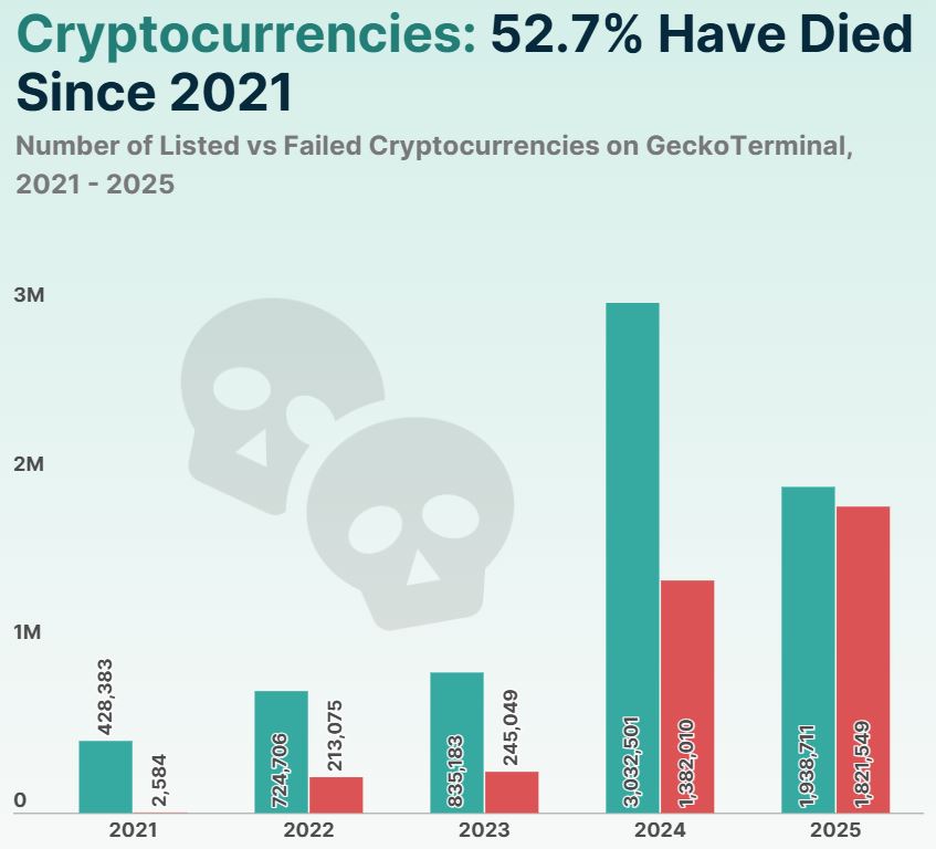 Починаючи з 2021 року, майже 7 мільйонів криптовалют було вказано на інструменті відстеження токенів Coingecko Geckoterminal, а понад половину, або 3,7 мільйона токенів, “з тих пір припинили торгування і вважаються невдалими”, – заявив аналітик дослідження Coingecko Шон Пол Лі у звіті 30 квітня.