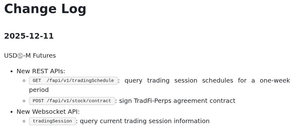 У журналі змін Binance зазначається, що 11 грудня біржа представила три нові кінцеві точки API, одна з яких — з URL-адресою, що містить акцію/контракт — дозволяє користувачам «підписати договір угоди TradFi-Perps». Дві інші кінцеві точки, представлені в той же день, дозволяють користувачам запитувати «розклади торгових сесій на один тиждень» або «інформацію про поточну торгову сесію».
