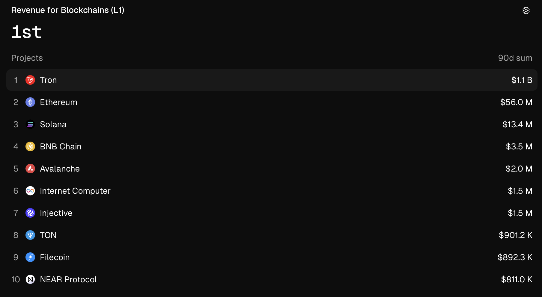 Протягом останніх семи днів Трон захопив 92,8% від загального доходу серед мереж Layer-1, випереджаючи Ethereum, Solana, BNB ланцюжок та лавину. Збори, отримані від транзакцій на TRON, становили 1,1 мільярда доларів за останні 90 днів.