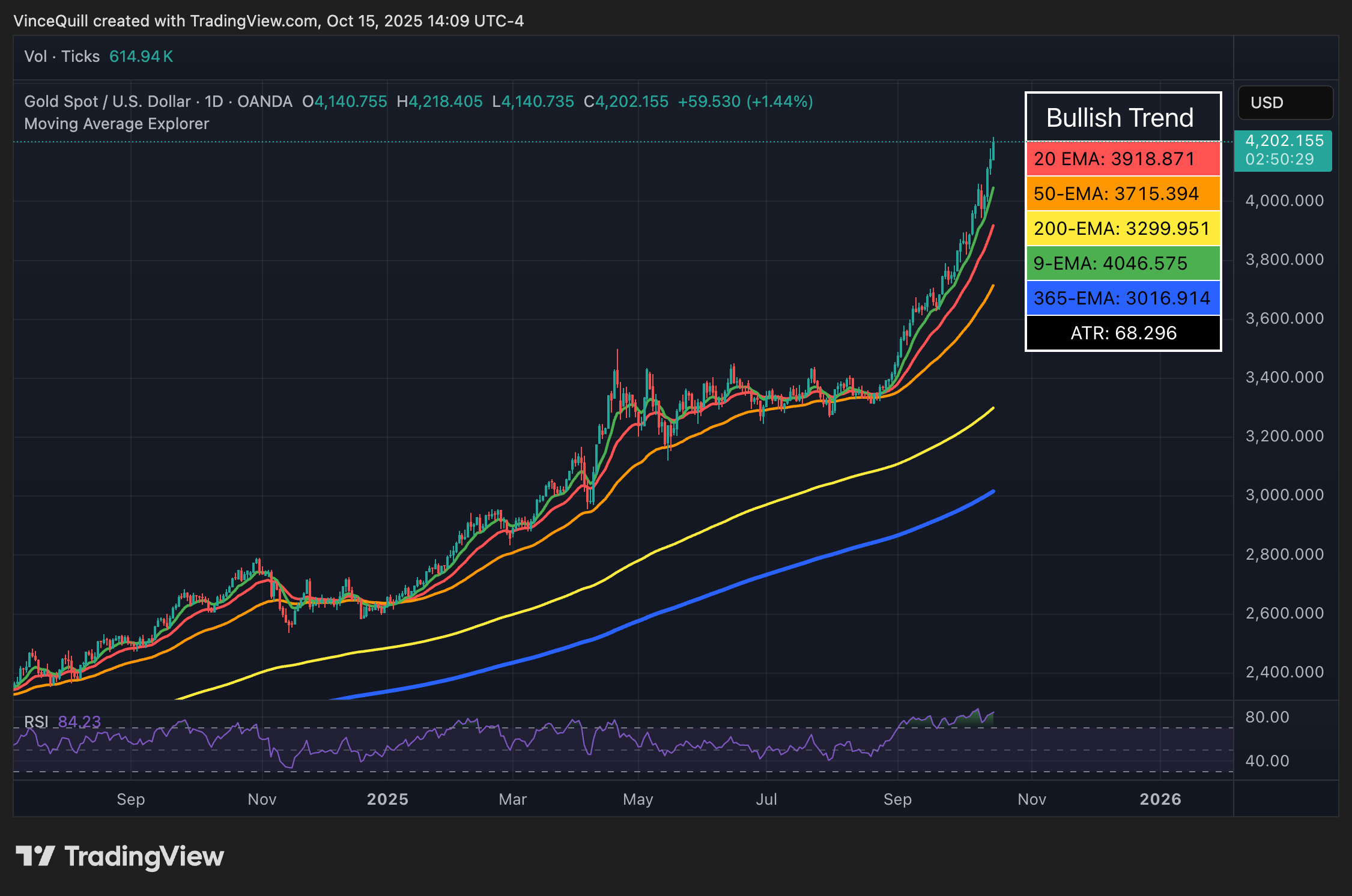 Золото досягло нового історичного максимуму в понад 4200 доларів США за унцію в середу, завдяки попиту з боку роздрібних споживачів, які купують фізичне золото, і центральним банкам, які накопичують дорогоцінний метал як захист від валютної інфляції.