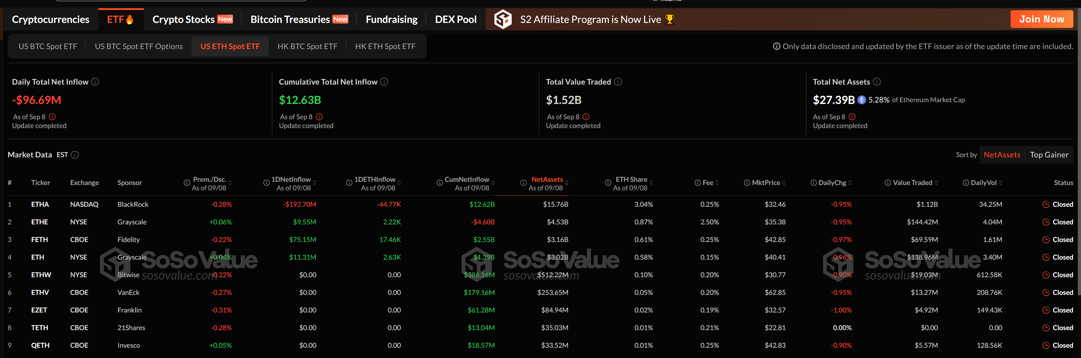 У понеділок ETHER (ETH) ETFS побачив чистий відтік 96,7 мільйонів доларів на чолі з ETHA BlackRock, який зафіксував 192,7 мільйона доларів з вилучення. Частково це було компенсовано приплив 75 мільйонів доларів у Fidelity’s Feth, 9,5 мільйона доларів на ETHE Greysale та 11 мільйонів доларів у його міні -фонд.