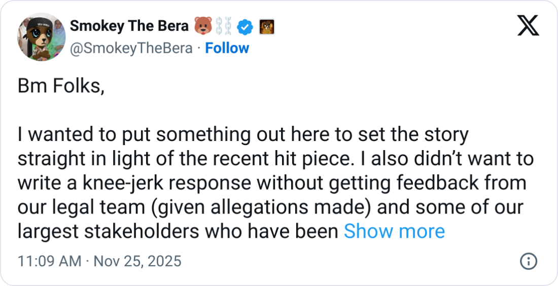 Smokey The Bera, анонімний засновник Berachain, заявив у понеділок, що звіт був «неточним і неповним», а «інвестиції Бревана передбачають кілька складних комерційних угод, але вони брали участь у зборі коштів серії B за тими ж документами, що й усі інвестори».