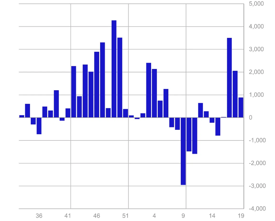 Тем не менее, последние 882 миллиона долларов притока были заметным перерядным разбирательством с 2 миллиарда долларов, которые можно увидеть в первую неделю мая и 3,4 миллиарда долларов, опубликованные на последней неделе апреля.