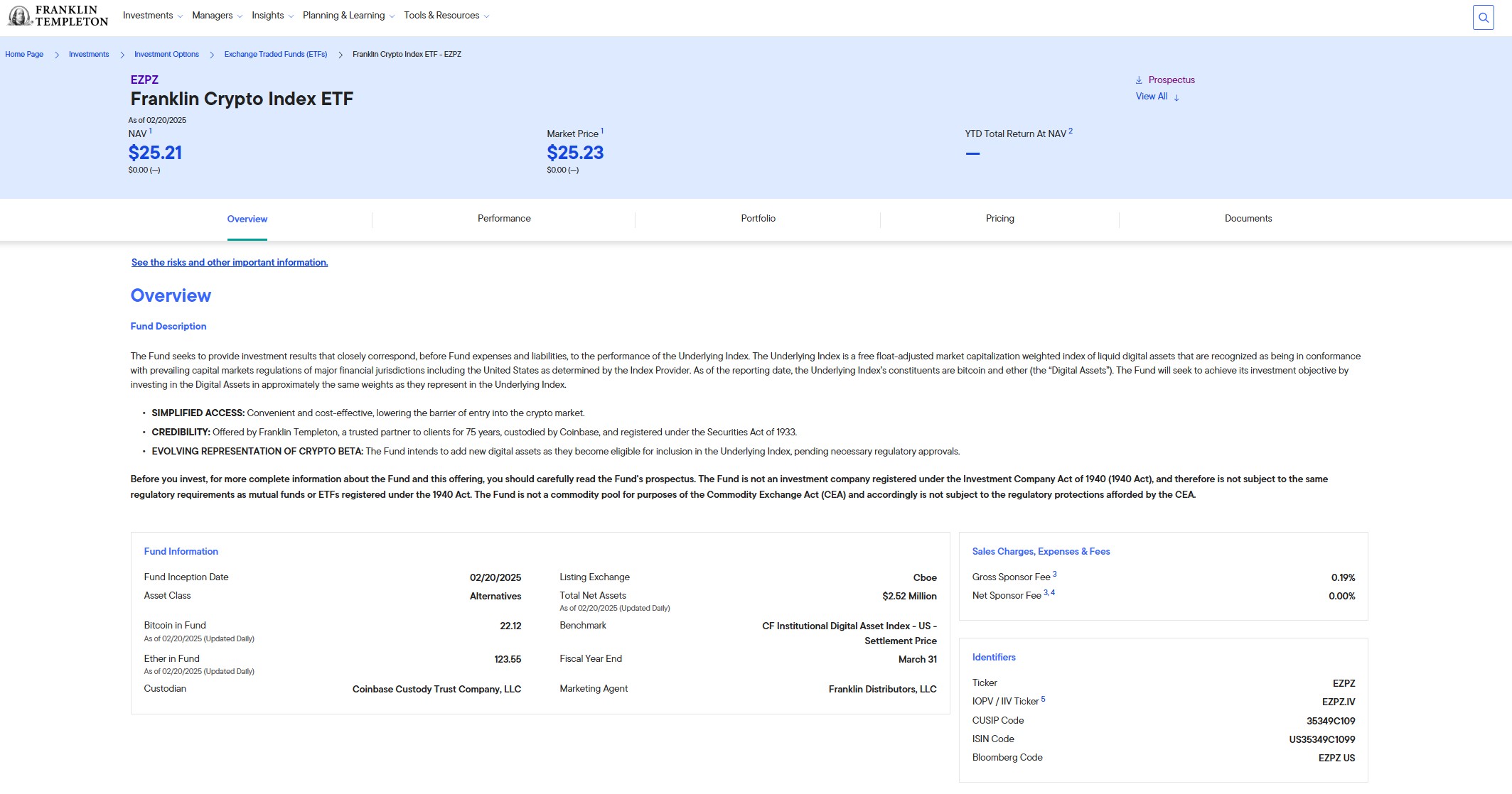 Franklin Cryptocurrency Index ETF (EZPZ), спонсируемый менеджером активов Франклина Темплтона, привлекла примерно 2,5 миллиона долларов в чистых активах с момента дебюта 20 февраля, согласно веб -сайту Franklin Templeton.