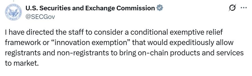 «Освобождение от инноваций может помочь выполнить видение президента Трампа, чтобы сделать Америку криптовалютой столицей планеты, поощряя разработчиков, предпринимателей и других фирм, которые готовы соблюдать определенные условия для инноваций в Onchain Technologies в Соединенных Штатах», – сказал он.