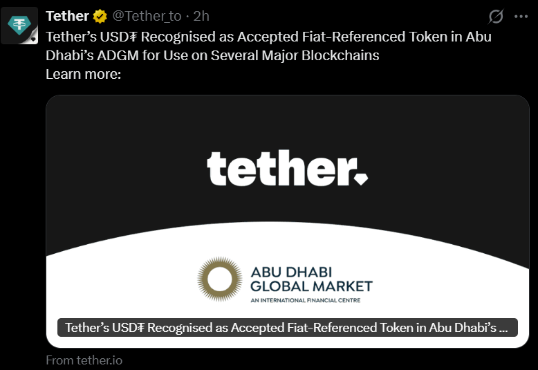 ADGM уже классифицировал USDT как принятый виртуальный актив при выпуске на Ethereum, Solana и Avalanche. Последнее признание расширяет эту структуру, потенциально повышая удобство использования USDT для трансграничных платежей, институционального хранения и расчетов.