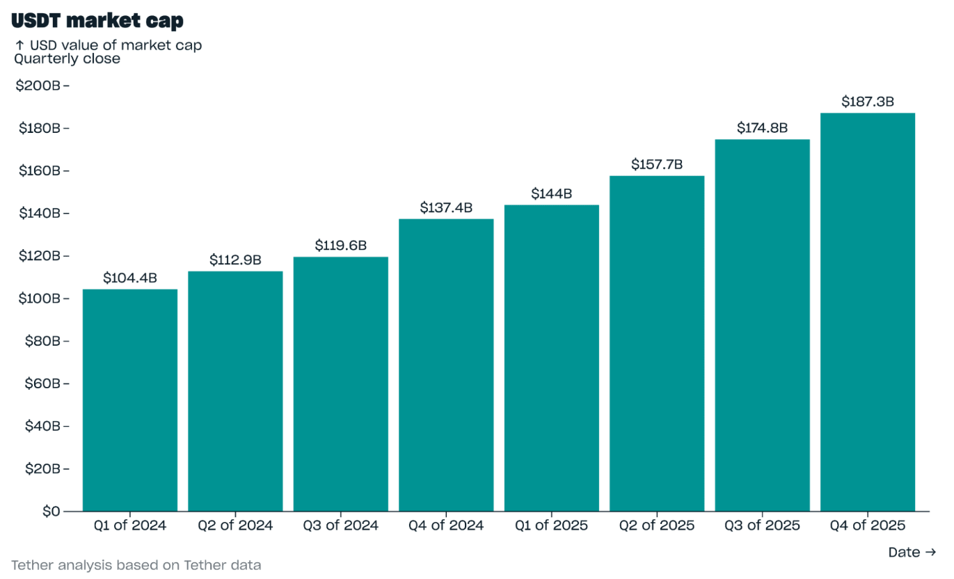 В четвертом квартале 2025 года стейблкоин Tether USDt, привязанный к доллару, увеличился до рекордной рыночной капитализации в 187,3 миллиарда долларов, даже несмотря на то, что более широкий рынок криптовалют упал после октябрьского каскада ликвидаций.
