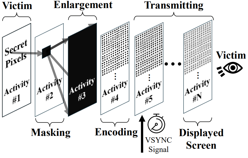 Это не так просто, как вредоносное приложение, запрашивающее и получающее доступ к отображаемому содержимому другого приложения. Вместо этого он накладывает стопку контролируемых злоумышленником полупрозрачных действий, чтобы замаскировать все, кроме выбранного пикселя, а затем манипулирует этим пикселем так, чтобы его цвет доминировал в кадре.