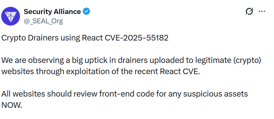 “Мы наблюдаем большой рост числа сборщиков, загружаемых на законные криптовалютные сайты благодаря использованию недавней версии React CVE. Все веб-сайты должны СЕЙЧАС проверять внешний код на наличие любых подозрительных активов”, – заявили в команде SEAL.