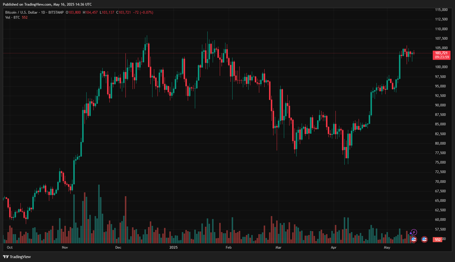 BTC в настоящее время торгуется на уровне 103 721 долл. США. Диаграмма: Tradingview