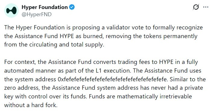 Hyper Foundation предложил провести голосование валидаторов, чтобы официально признать токены HYPE, хранящиеся в системном адресе Фонда помощи протокола Hyperliquid, как постоянно недоступные, исключив их из оборотного и общего предложения актива.