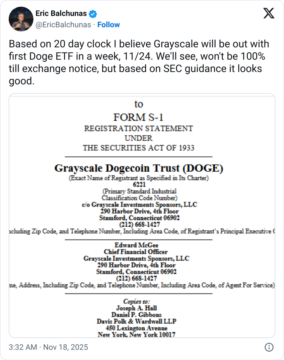 Балчунас сказал, что он ожидает, что ETF Dogecoin (DOGE) от Grayscale будет запущен 24 ноября на основании измененной нормативной документации, представленной ранее в этом месяце, начиная с 20-дневного периода, в течение которого он может быть запущен, если SEC не ответит.