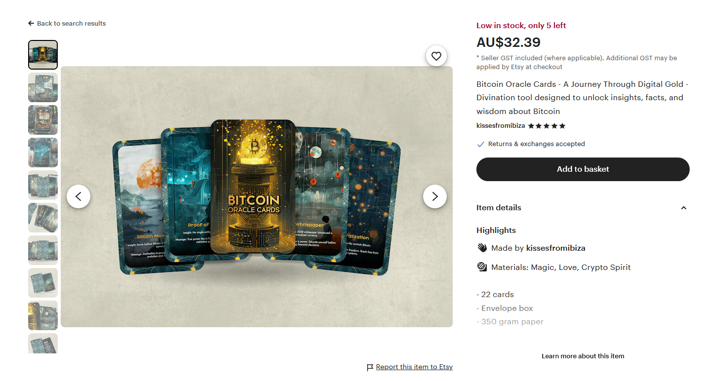 Это также не просто останавливается в колдовстве. Есть также несколько продавцов в Etsy, предлагающих такие услуги, как «Bitcoin Oracle Cards», которые позволяют клиентам читать их будущее. Карты, по -видимому, сделаны с «магией, любви» и «духом криптовалюты».
