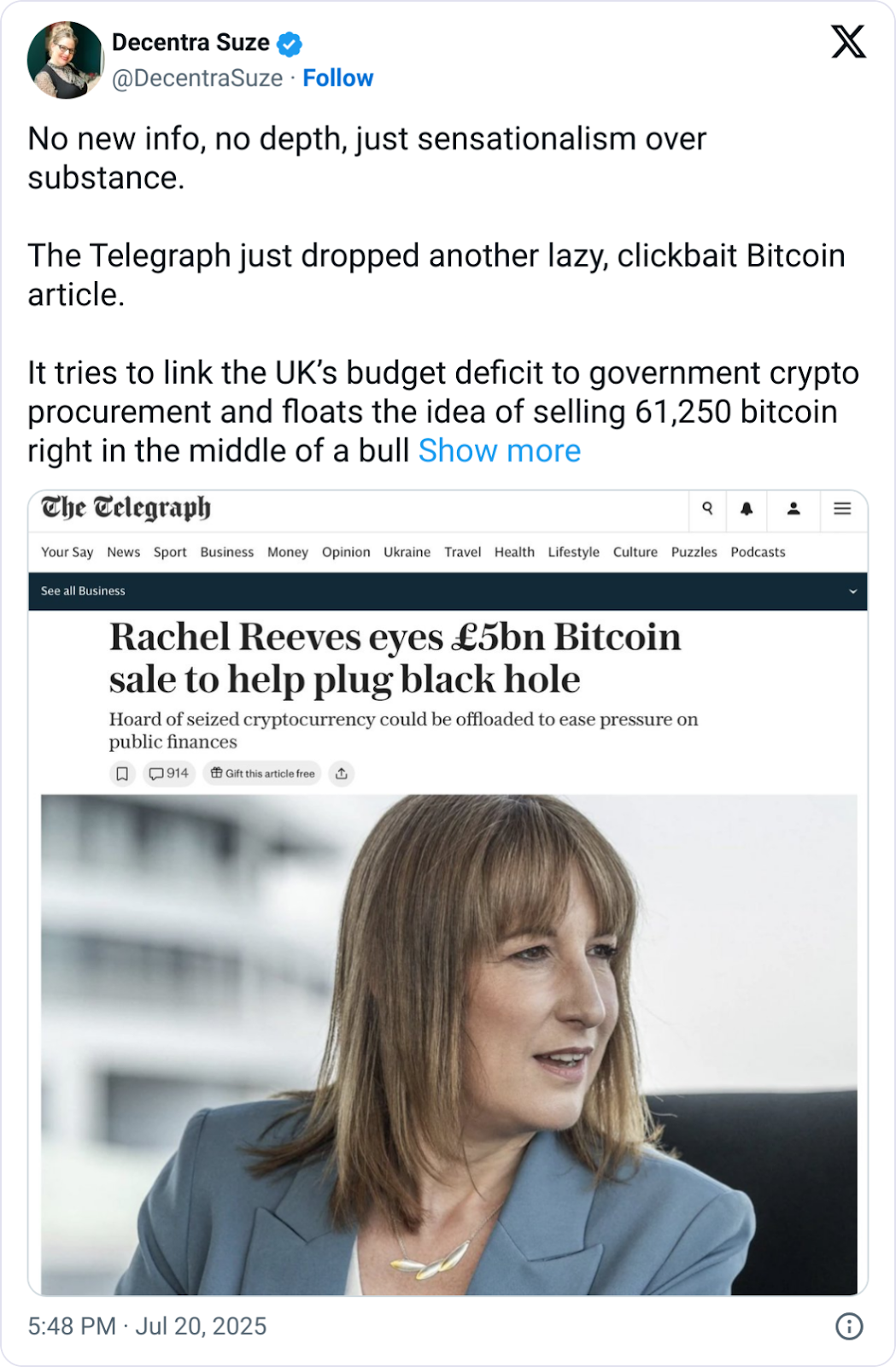 «Биткоин Великобритании по -прежнему оспаривается юридически», – заявила Сьюзи Вайолет Уорд, генеральный директор Cryptocurrency Lobby Group Bitcoin Policy UK, в воскресенье в воскресенье, заявив о «сенсационном смысле над субстанцией».