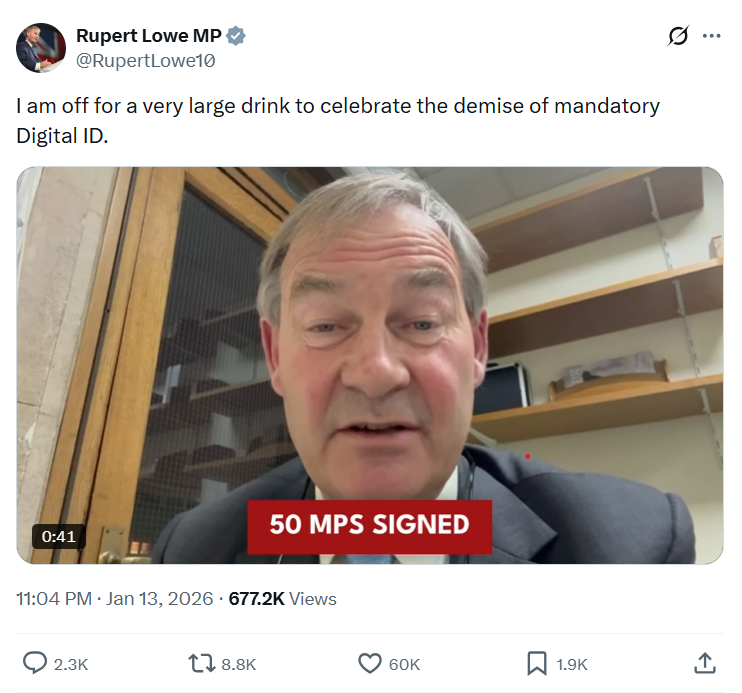 Около трех миллионов человек подписали парламентскую петицию против цифровых удостоверений личности. Лоу отпраздновал изменение политики в видео на X, заявив, что он собрался «выпить очень много, чтобы отпраздновать отмену обязательного цифрового удостоверения личности», а Фараж сказал, что это «победа свободы личности над ужасным авторитарным правительством».