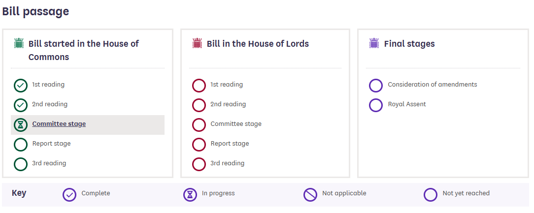 Законопроект находится на стадии рассмотрения в Палате общин. Чтобы стать законом, он должен пройти через Палату общин и Палату лордов, а затем быть одобрен королем Карлом III.