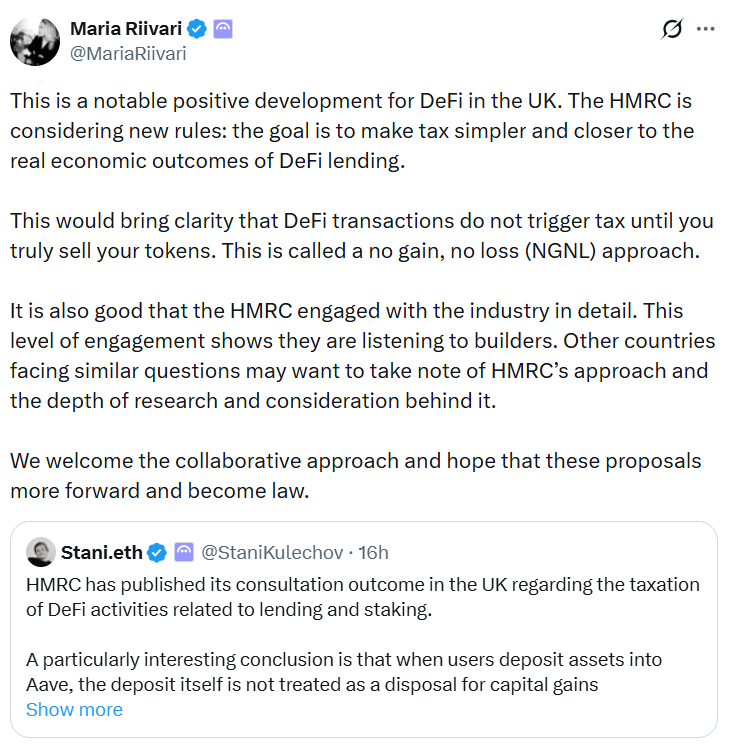 Мария Риивари, юрист платформы DeFi Aave, сказала, что это изменение «внесет ясность в то, что транзакции DeFi не облагаются налогом до тех пор, пока вы действительно не продадите свои токены».