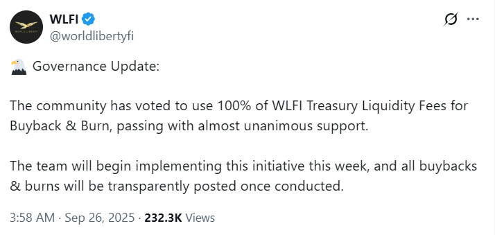 В пятницу World Liberty объявила, что ее команда будет реализовать механизм выкупа токена и сжигания на следующей неделе. Проект заявил, что эта инициатива будет публично раскрыта, обещая обмениваться обновлениями о каждом выкупе и сжигании после их проведения.