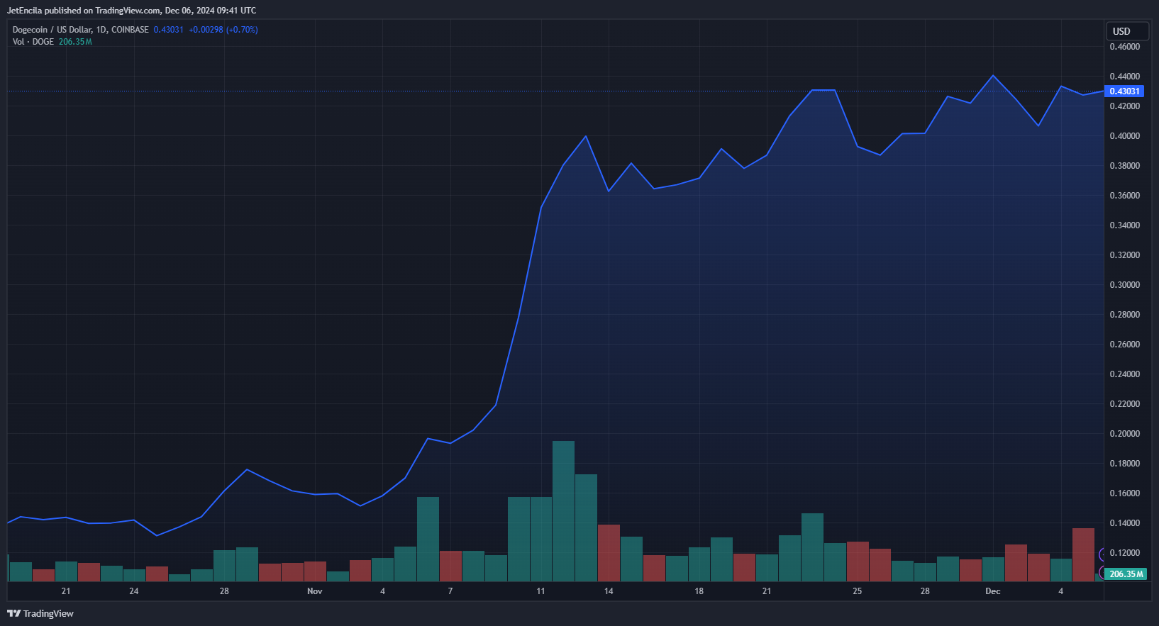 DOGE в настоящее время торгуется на уровне $0,43. График: TradingView