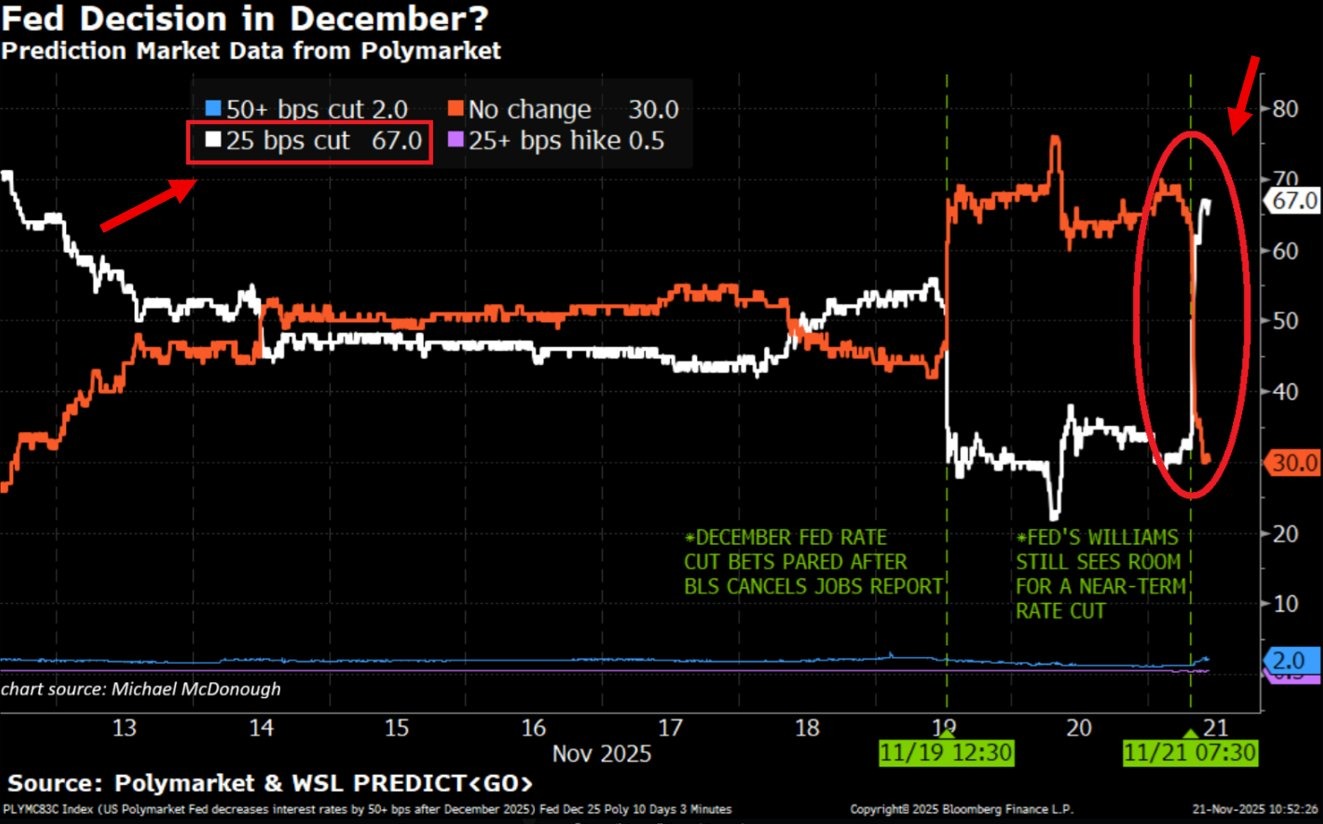 Вероятность снижения ставки Федеральной резервной системой в декабре упала примерно до 30% на прошлой неделе, но с тех пор вернулась к 70%, сказал Эдвардс.
