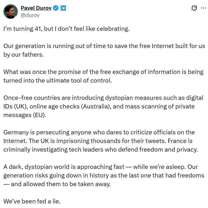 “Мне исполняется 41 год, но мне не хочется праздновать. У нашего поколения заканчивается время, чтобы спасти бесплатный интернет, созданный для нас нашими отцами”, – сказал Дуров в X-посте в четверг.