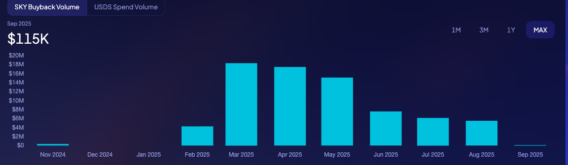 Для сравнения, токены аналогичных платформ UnisWap (UNI) и AAVE (AAVE) получили соответственно 6% и 25,8% с тех пор, как Sky начал свой выкуп, причем оба видели в середине августа.