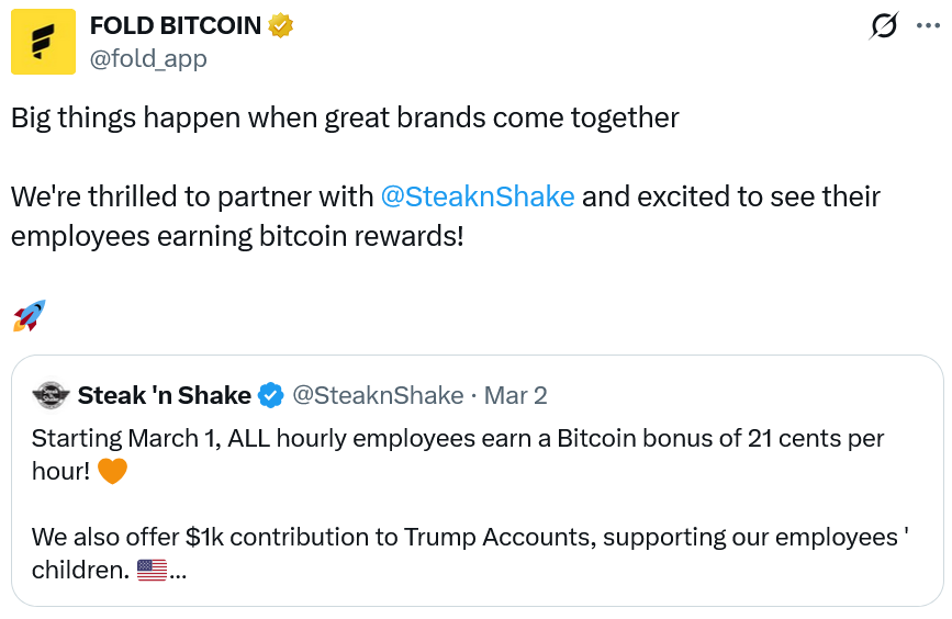 Во время отчета Fold о прибылях и убытках за четвертый квартал и 2025 год во вторник генеральный директор Уилл Ривз заявил, что, по их мнению, «вознаграждения в биткоин превзойдут мили авиакомпаний в качестве предпочтительного вознаграждения потребителей в США».