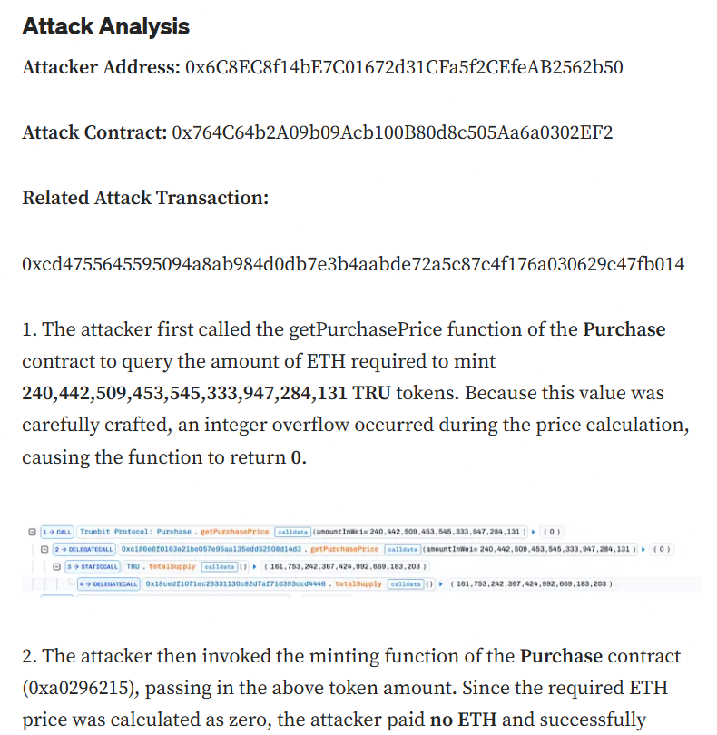 «Из-за отсутствия защиты от переполнения в операции сложения целых чисел контракт на покупку протокола Truebit дал неверный результат при расчете количества ETH, необходимого для чеканки токенов TRU», — заявили в SlowMist.