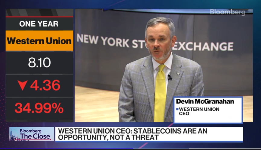 Во время интервью в понедельник с Bloomberg генеральный директор Western Union Девин МакГранахан заявил, что компания рассматривает возможность стаб -эпохи. Он также сказал, что он изучает партнерские отношения с крупными игроками индустрии криптовалют, предлагающих StableCoin в RAMP и вне RAMP, а также цифровой кошелек.