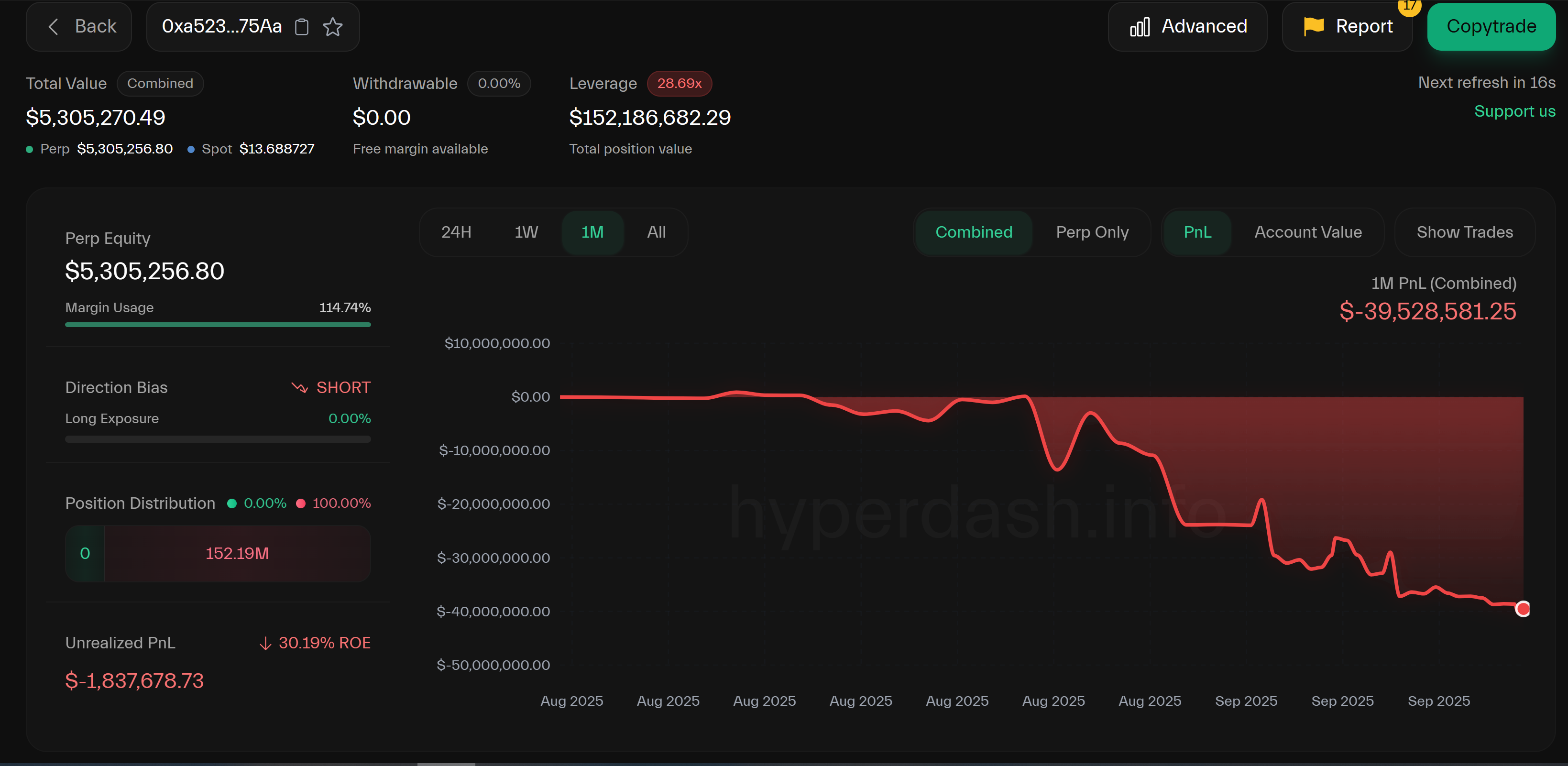HyperDash показывает, что кошелек занимает позицию в размере 152 миллионов долларов с 28,69 -кратным рычагом и имеет комбинированную ежемесячную потерю в 39,5 млн. Долл. США. Использование маржи составляет 114,74%, с полным воздействием коротких позиций.