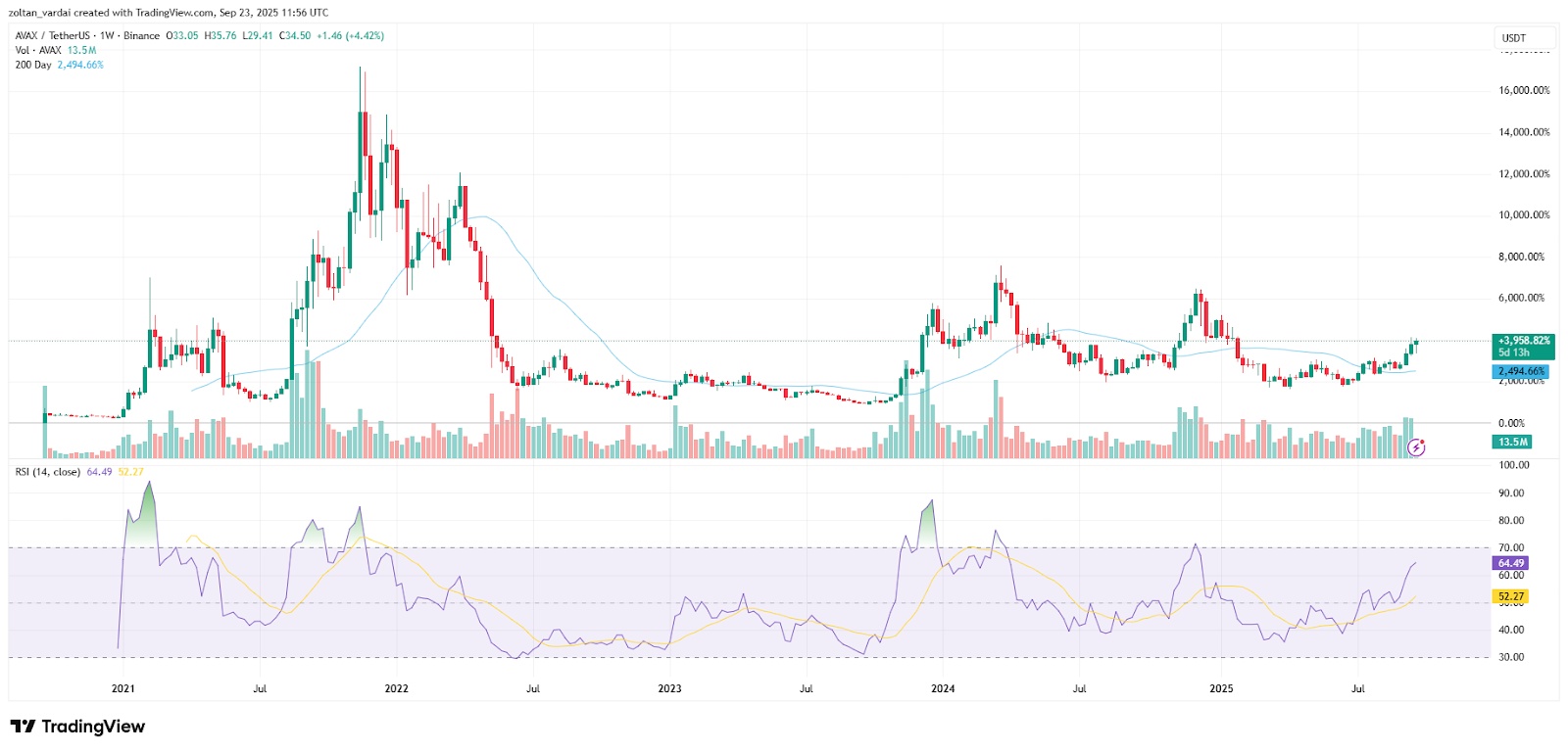 Несмотря на последнюю волну корпоративного усыновления, токен Avax остается более чем на 76% ниже, чем в максимуме за все время в 146 долларов почти четыре года назад 21 ноября 2021 года, показывают данные TradingView.