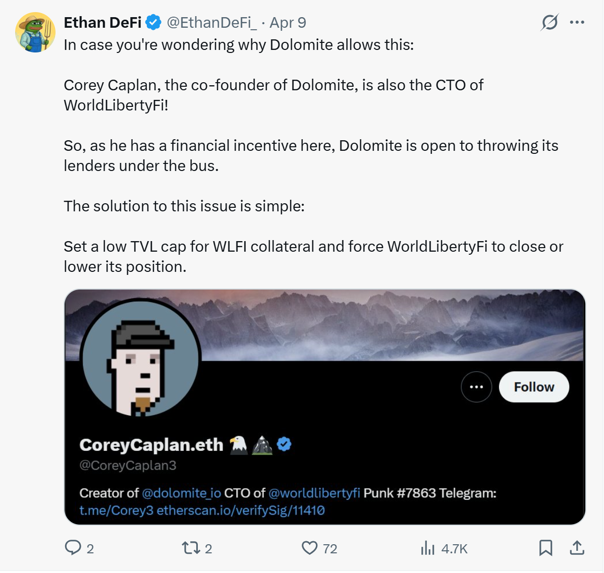 Спад произошел после того, как выяснилось, что кошельки, связанные с World Liberty Financial, разместили значительные активы WLFI в качестве залога на Dolomite, децентрализованной кредитной платформе, соучредителем которой является технический директор проекта Кори Каплан.