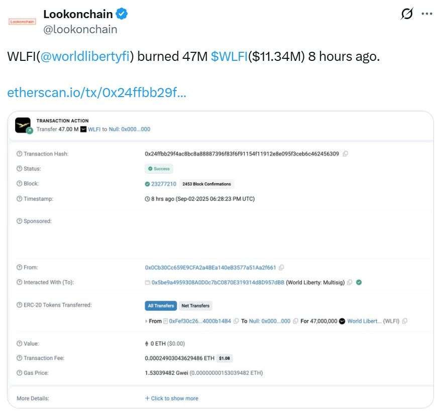 Данные на цепочке впервые сообщили в Loutonchain, что в среду платформа сгорела 47 миллионов токенов World Liberty Financial (WLFI), навсегда убрав их из предложения.