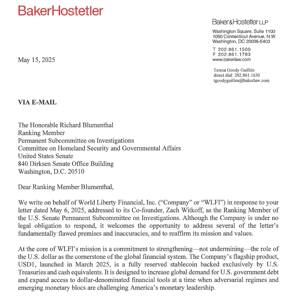 В письме 15 мая сенатору Ричарду Блюменталу, адвокаты World Liberty Financial заявили, что призыв к расследованию платформы криптовалюты был основан на «принципиально ошибочных помещениях и неточностях». Виткофф конкретно не рассматривал каких -либо обвинений, утверждая, что WLFI был «слишком занят строительством» для надзора.