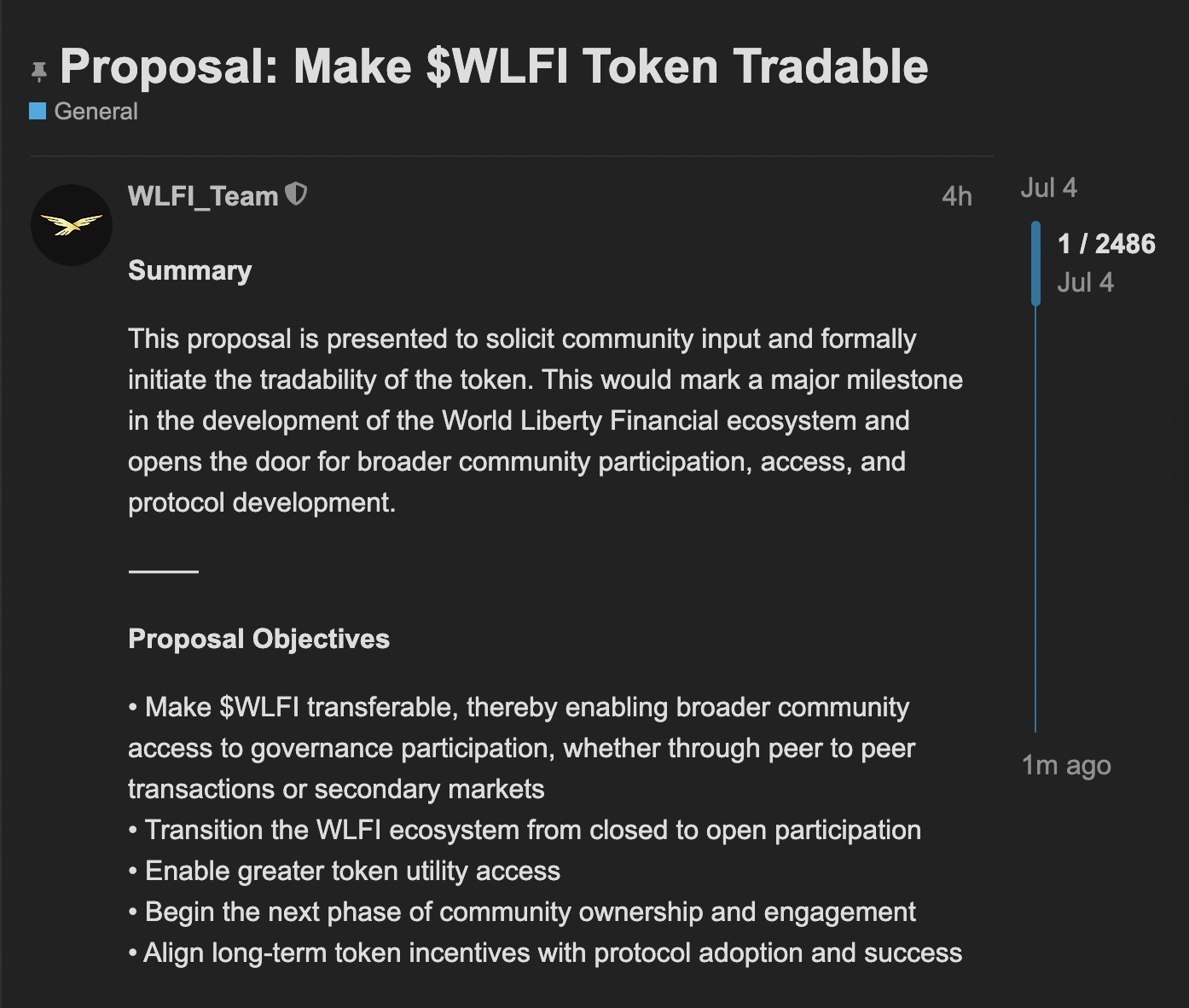 World Liberty Financial (WLFI), децентрализованный протокол финансов, соучрединный семьей президента США Дональда Трампа, инициировал предложение сообщества, чтобы сделать токен управления WLFI, подлежащую передаче и торговле в экосистеме криптовалюты.