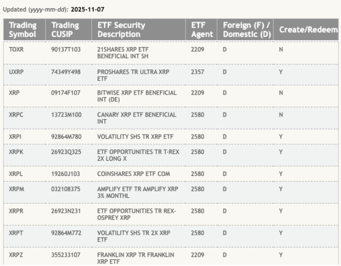 По состоянию на понедельник веб-сайт DTCC включил в свой «активный» и предварительный список 11 продуктов XRP ETF, в том числе продукты 21Shares, ProShares, Bitwise, Canary Capital, Volatility Shares, REX-Osprey, CoinShares, Amplify и Franklin Templeton.