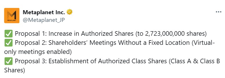 На необычайном общем собрании в понедельник инвесторы вносят поправки в области инкорпорации компании, чтобы расширить свои уполномоченные акции до 2,7 миллиарда. Он также ввел новую привилегированную акционерную систему с двойным классом, которая позволила бы MetaPlanet привлекать различные типы инвесторов, сохраняя при этом контроль для существующих акционеров.