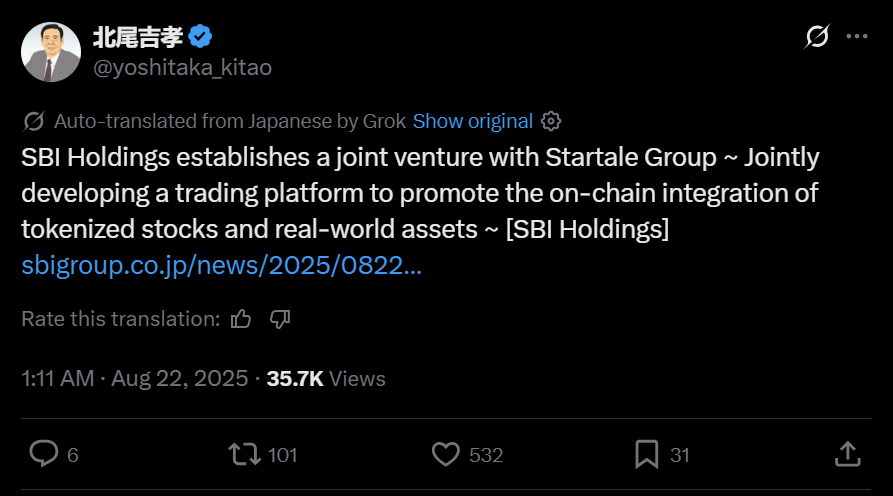 В рамках сотрудничества SBI работает с Startale, чтобы построить платформу для токенизированных акций и других активов реального мира.