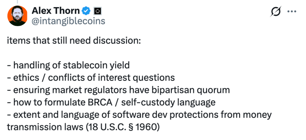 Другие менее оптимистичны в отношении того, что это произойдет так скоро. Руководитель исследовательского отдела Galaxy Digital Алекс Торн заявил во вторник в посте X, что после рассмотрения документа двухпартийной встречи в Сенате во вторник «неясно, смогут ли обе стороны объединиться и сделать это двухпартийное заседание, поскольку множество вопросов все еще не решены».