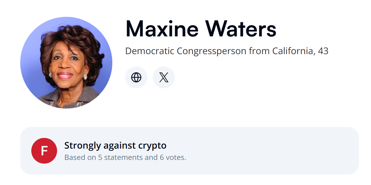 Уотерс указан группой как «решительно против криптовалюты» на основании пяти заявлений и шести голосов против законодательства о криптовалютах, включая Закон о ясности рынка цифровых активов и Закон о гениях.