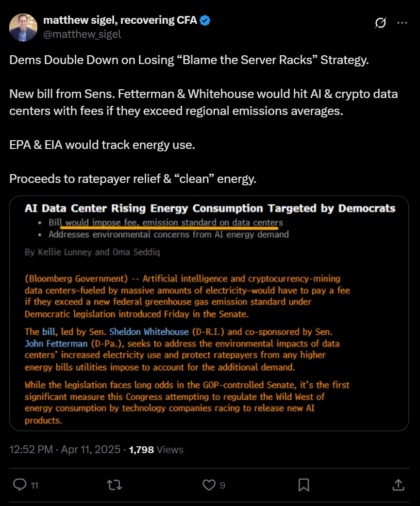 Проект законодательства в Сенате США угрожает попасть в центры обработки данных, обслуживающие сети блокчейн и модели искусственного интеллекта с платами, если они превышают федеральные цели выбросов, согласно отчету Bloomberg от 11 апреля.